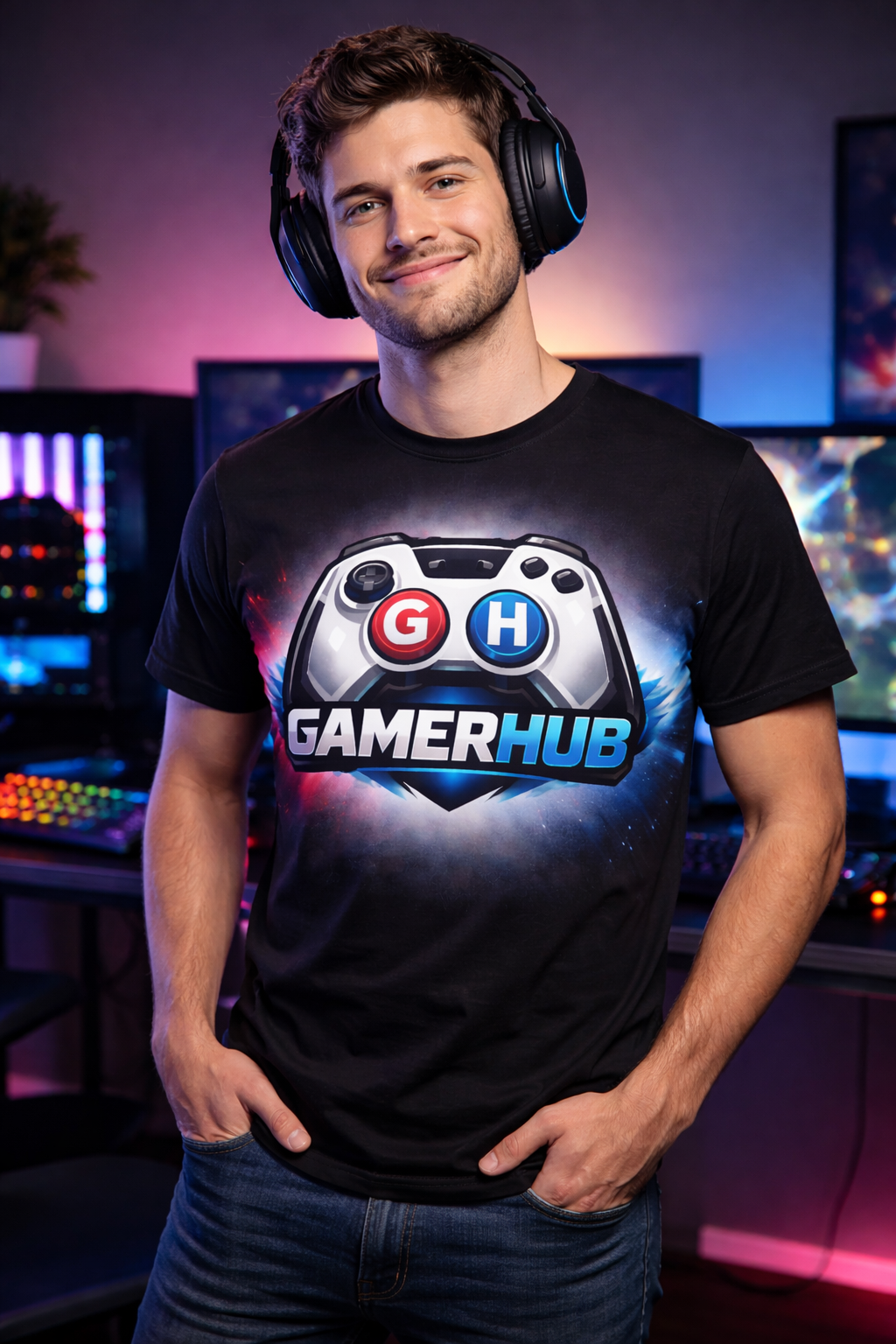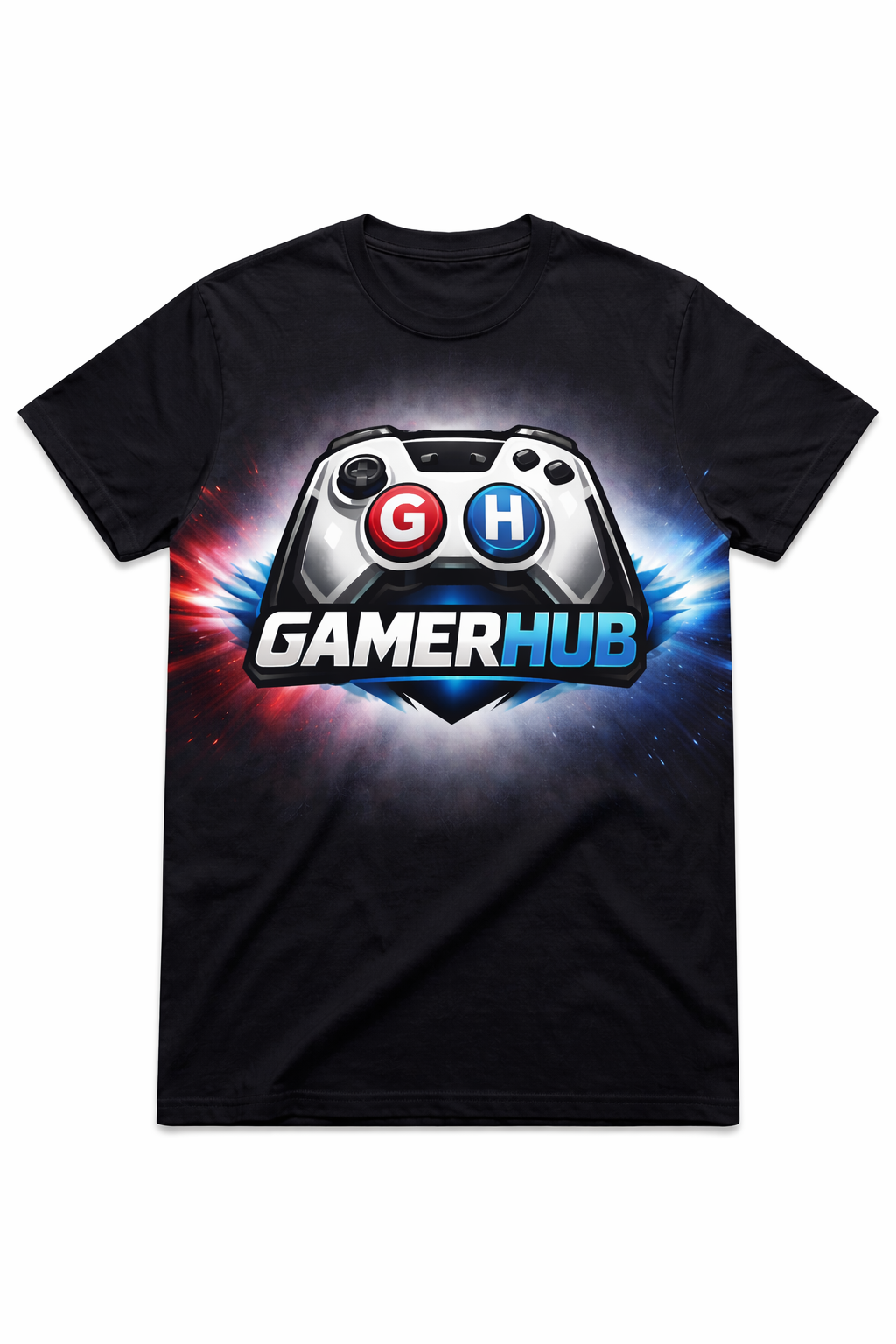 Exprésate como un auténtico gamer con la Camiseta GamerHub, una prenda diseñada para quienes viven el gaming dentro y fuera de la pantalla. Su potente diseño frontal presenta el icónico mando GamerHub con los botones G en rojo y H en azul, acompañado de un fondo energético en degradado rojo–azul que transmite fuerza, competitividad y personalidad.